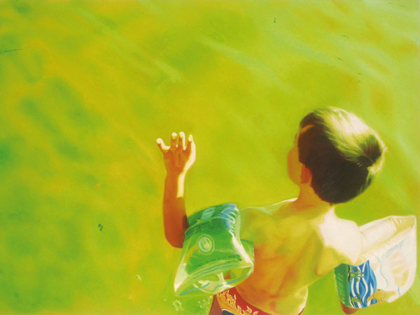 Die Bilderwelt aus der Elke Fech schöpft, ist die Urlaubsfotografie. Fotos wie wir sie von unseren badenden Kindern schon alle gemacht haben, Fotos die zu tausenden in den Fotoalben im Bücherregal stehen. Es geht Elke Fech in ihren Bildern aber um weit mehr als ein reines Abmalen des fotografischen Vorbildes. Die Malerin überhöht die fotografische Wirklichkeit, indem sie das 9 x 13 Format in riesige Bilder verwandelt und mit der Wahrnehmung spielt. Das ganz und gar Vertraute wird auf ihren Bildern mit subtilen Mitteln verfremdet, löst sich vom Geschehen ab und bleibt als verwirrendes Bild im Betrachter hängen.