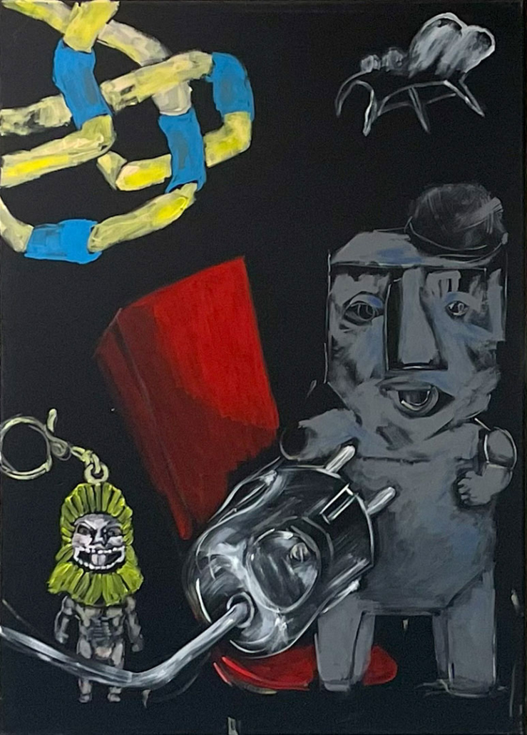 Ihre Figuren wirken wie alte Puppen und Spielzeuge, die zum Leben erwachen. Ein Spiel zwischen toter und lebendiger Materie. Wie der Papst im weißen Gewand mit einem Aufziehschlüssel im Rücken („Die Puppen tanzen auch mit Löchern in den Sohlen“) oder die quadratische Puppe mit riesigem Elektrostecker, der sie mehr bedroht als mit Energie versorgt („In der Not fängt der Teufen Fliegen mit zwei Klappen“).