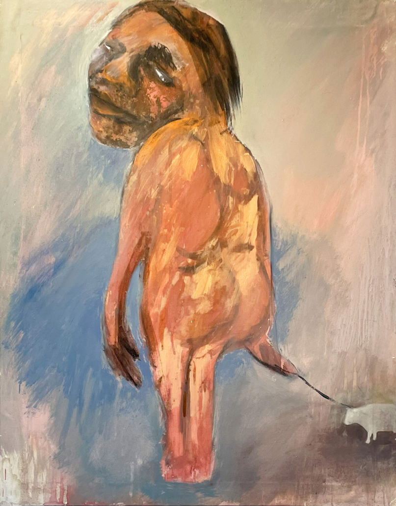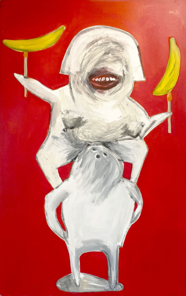 Kathrin Krumbein liebt das Groteske, wie die unförmige nackte Gestalt mit viel zu großem Kopf, hilflos und einfältig und kleinen weißen Augen, die einen winzig kleinen Hund an der Leine hält. Oder ist es eine Kuh? („Wer nicht hören will, muss führen“). Oder die zwei aufeinander stehenden Akrobaten, weiße verschleierte Geister, die obere mit spitzen Brüsten und einem riesigen roten Mund voller Zähne, die zwei Bananen auf Streichhölzern balanciert („Wer kocht für den Koch?“).