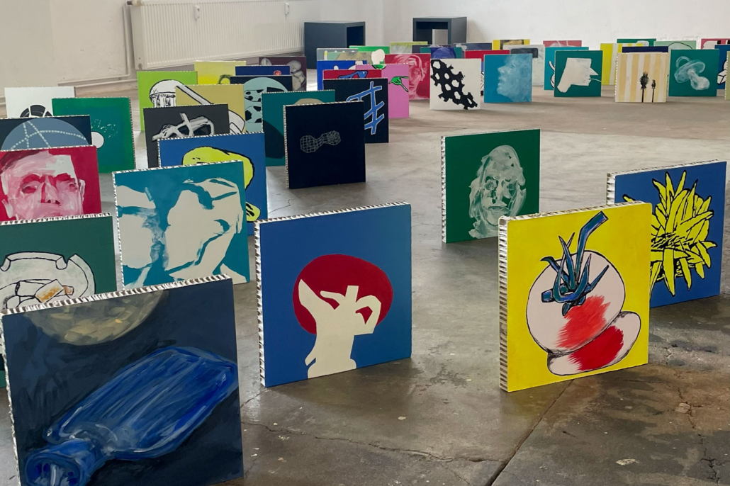 60 kleine Wellpappenbilder haben sich selbständig gemacht, die Wand verlassen und marschieren in Reih und Glied dem Betrachter entgegen. Quadratisch, praktisch und beidseitig tragen sie jeweils ein Motiv aus dem Krumbein-Universum in die Welt hinaus: Figuren, Köpfe, Elektrostecker, Schrauben, Gerüste, Tassen, Wollknäul und vieles, vieles mehr.